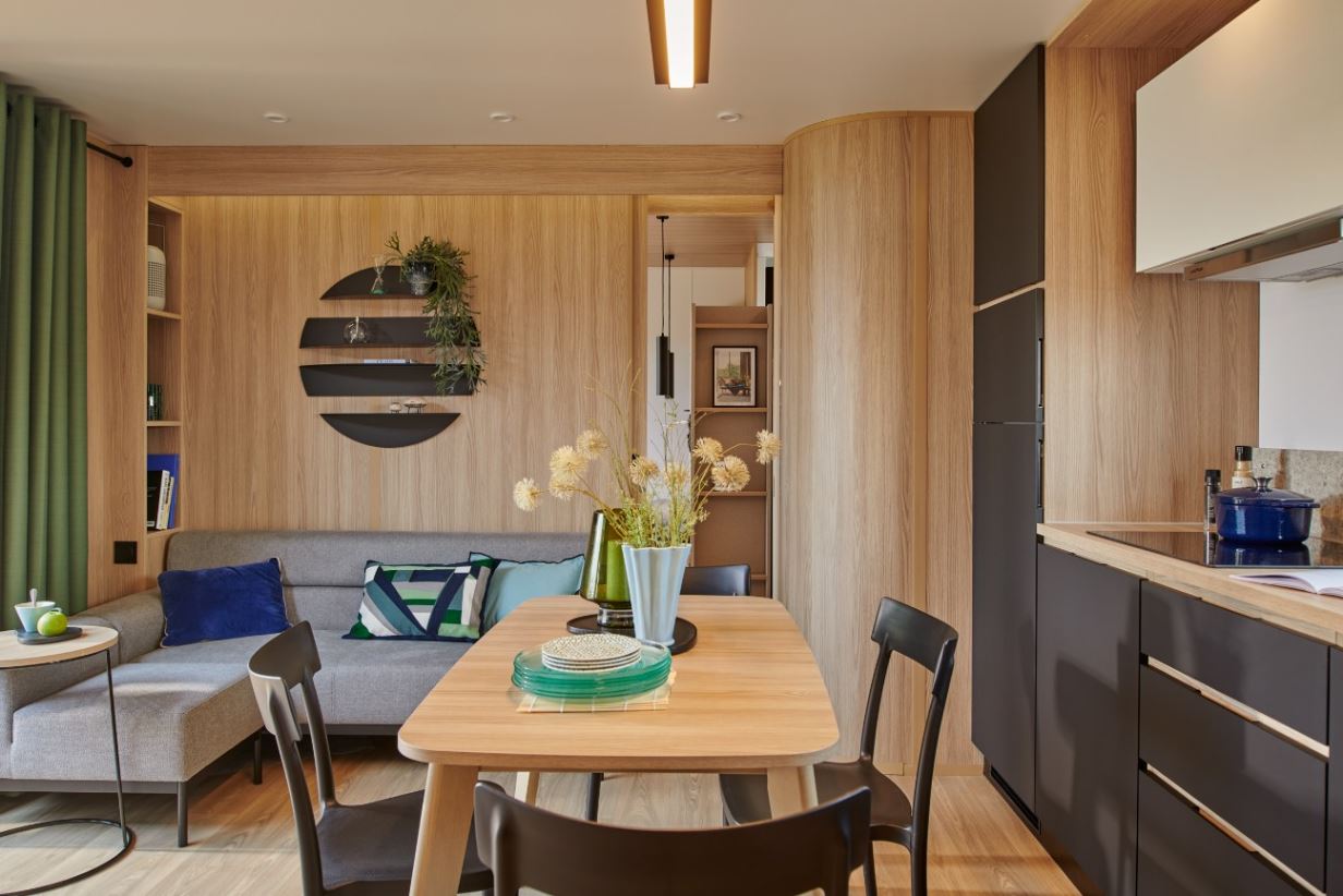 Sa lumineuse pièce de vie appelle à la convivialité et sa cuisine équipée d'un lave-vaisselle permet de gagner du temps pour profiter encore plus des vacances !